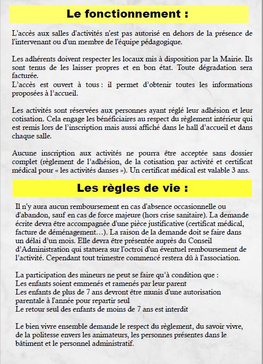 Les activités sont réservées aux personnes ayant réglé leur adhésion et leur cotisation. Cela engage ses bénéficiaires au respect du règlement intérieur qui est affiché dans le hall d’accueil.